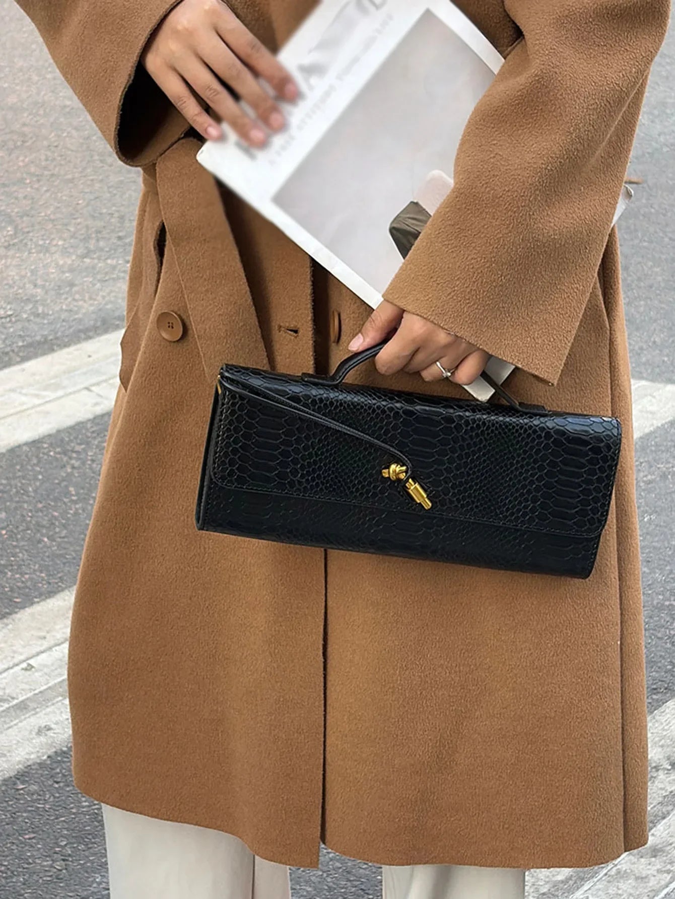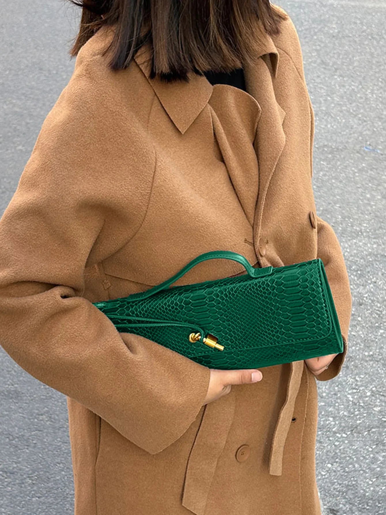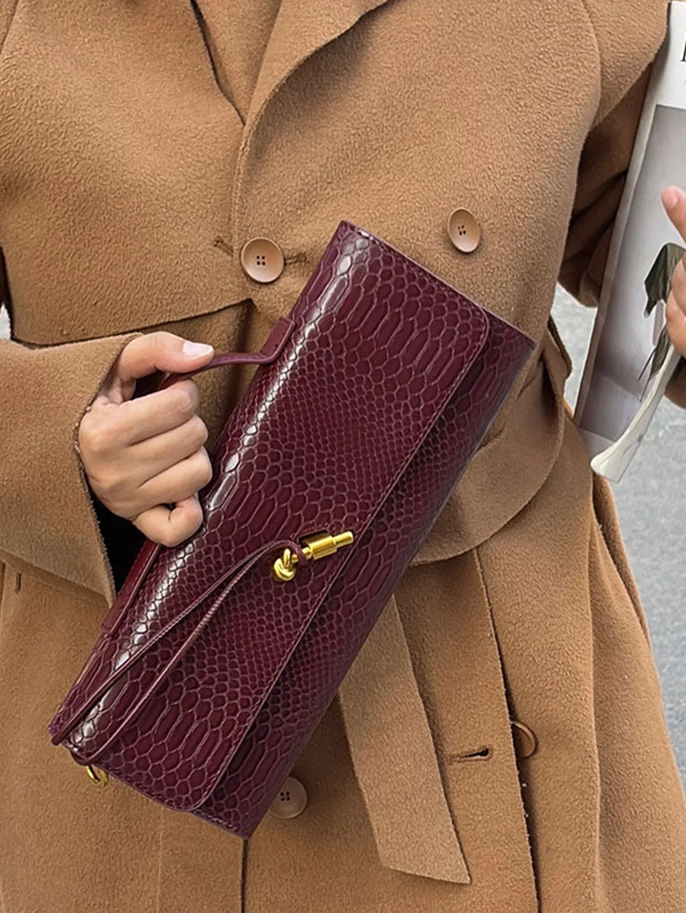 Eine luxuriöse Handtasche im Envelope-Design – modern und edel zugleich. Diese Tasche ist das perfekte Accessoire für elegante Abendveranstaltungen oder stilvolle Ausflüge. Ihr raffiniertes Design und die markante Krokodilleder-Optik machen sie zu einem echten Hingucker.