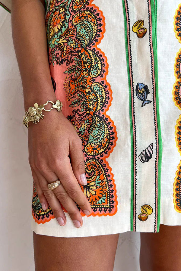Dieses exquisite Hemdkleid fasziniert mit seinen kunstvollen Paisleymustern und lebendigen Farbpaletten. Es wurde mit einem ordentlichen, spitzen Kragen und kurzen Ärmeln entworfen und kombiniert traditionellen Charme mit modernem Stil. Die gerade geschnittene Silhouette sorgt für eine bequeme Passform, während die filigranen Randdetails einen Hauch von Eleganz verleihen.