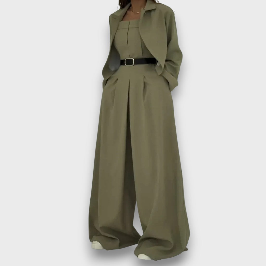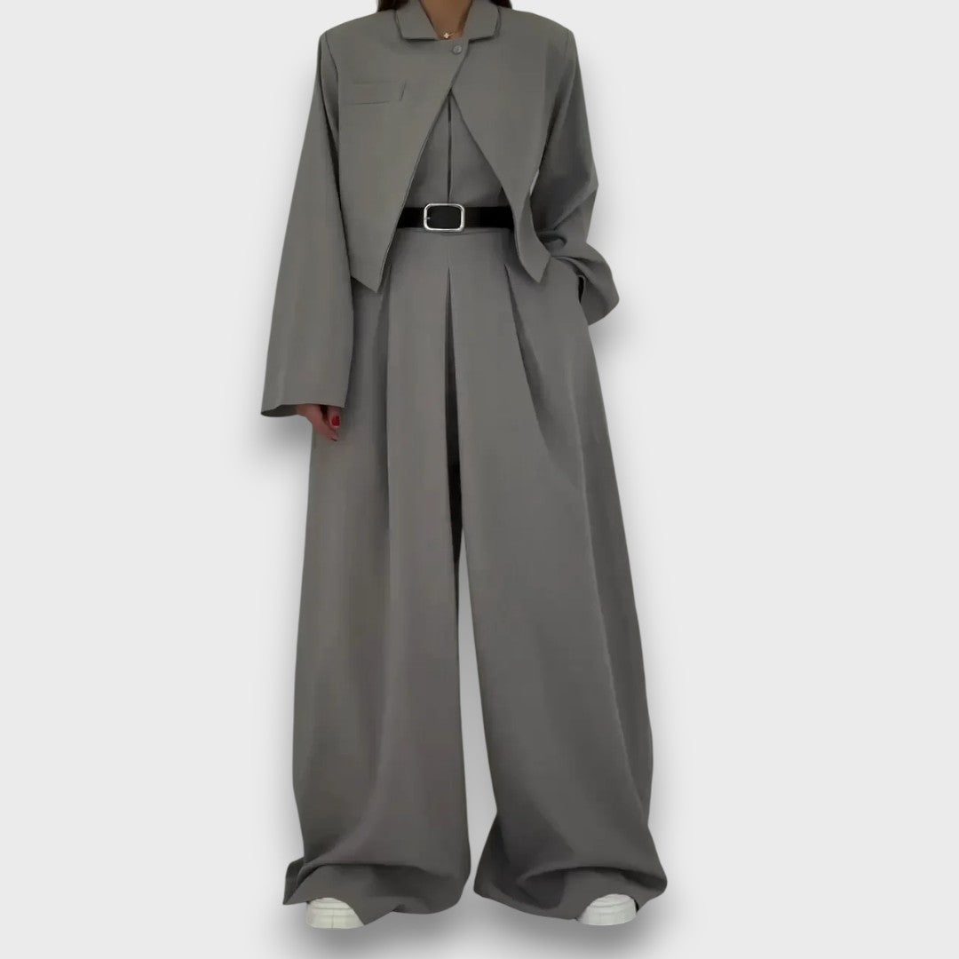 Leicht und fließend – Die weite Hose und die lockere Jacke schenken Bewegungsfreiheit und verleihen eine moderne, entspannte Eleganz.
