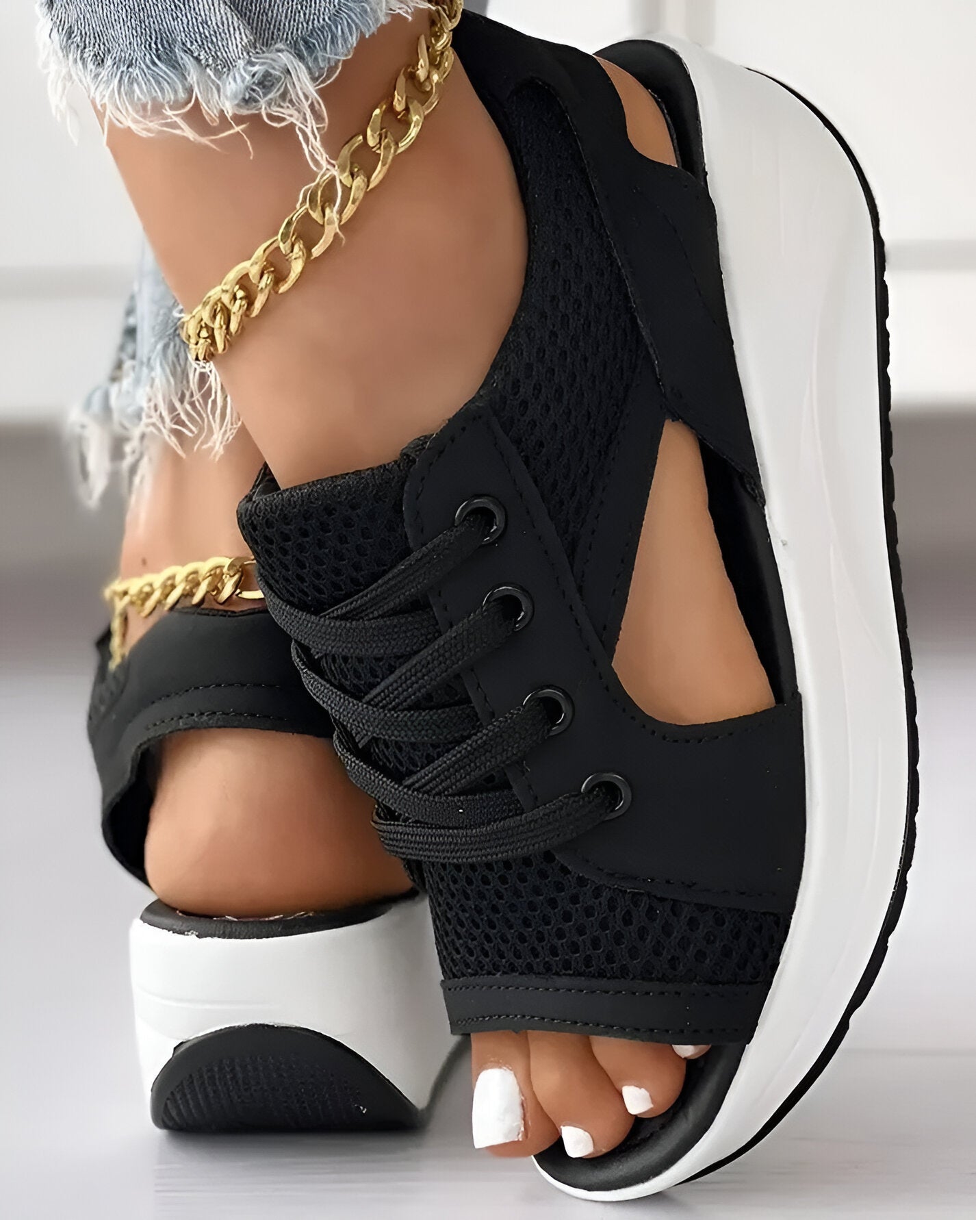 Mit ihren auffälligen Cutouts und Schnürdetails verleihen diese Sandalen deinem Outfit einen modernen, stilvollen Akzent und sorgen dafür, dass du überall im Mittelpunkt stehst. Die gepolsterte Muffin-Sohle bietet hervorragenden Halt und sorgt dafür, dass du den Tag stilvoll und entspannt meistern kannst.