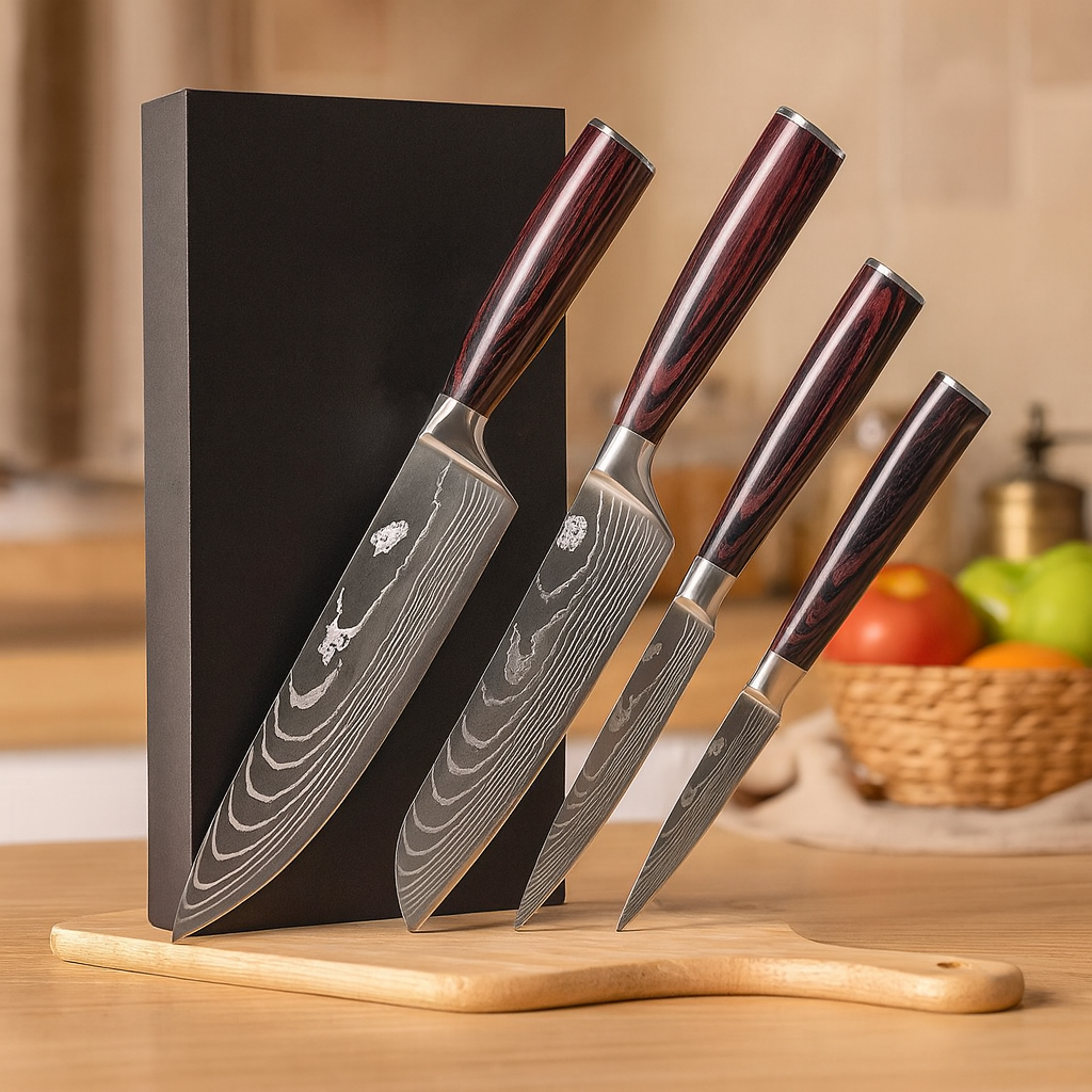 Komplettes 4-teiliges Set – bestehend aus Kochmesser, Allzweckmesser, Schälmesser und Hackmesser.