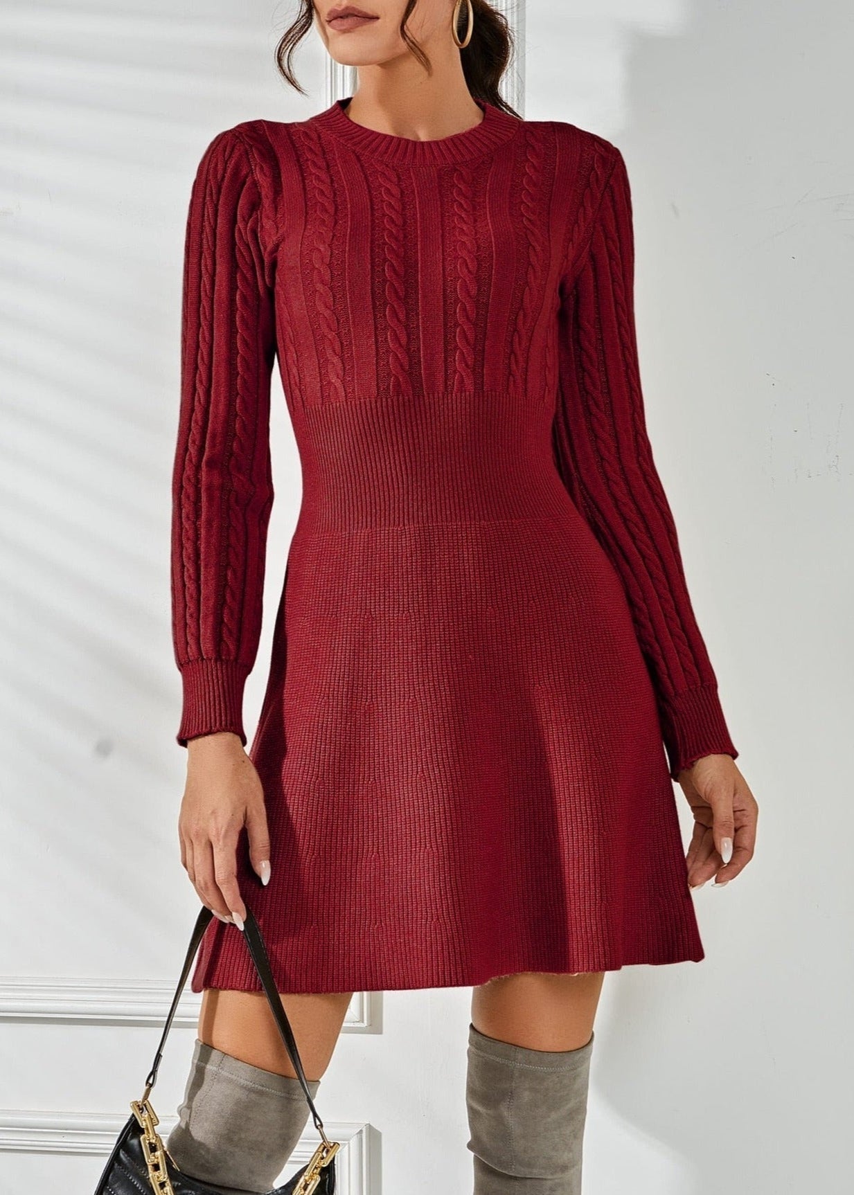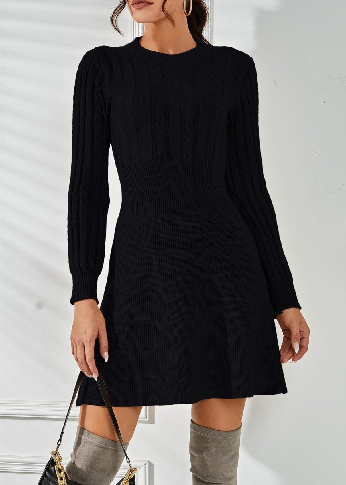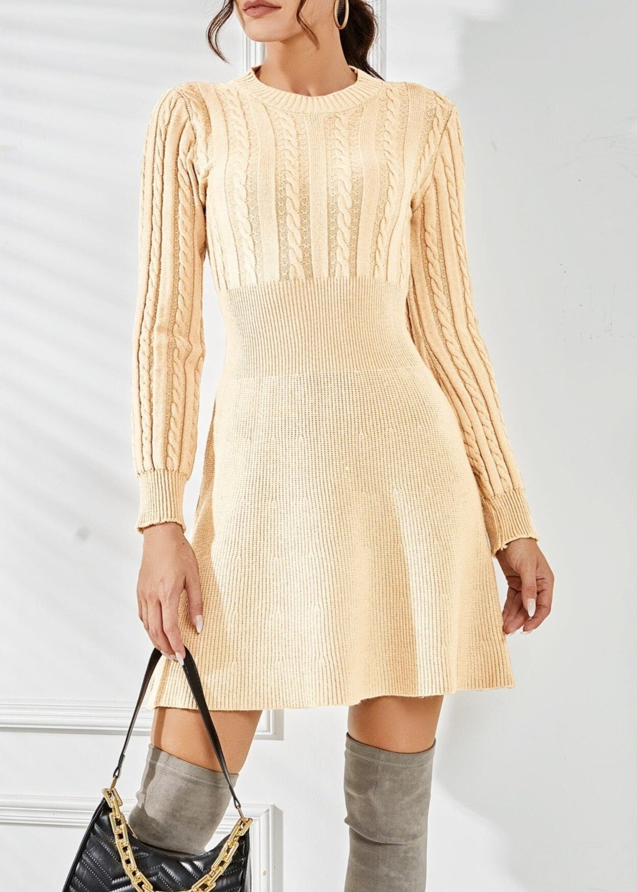 Verleihen Sie Ihrer Garderobe mit diesem schicken Strickkleid einen Hauch von Eleganz, perfekt für kühlere Tage und mühelosen Stil. Mit einer schmeichelhaften A-Linien-Silhouette, komplizierten Zopfmuster-Details und einem eleganten Rundhalsausschnitt ist dieses Kleid eine vielseitige Wahl für jeden Anlass.