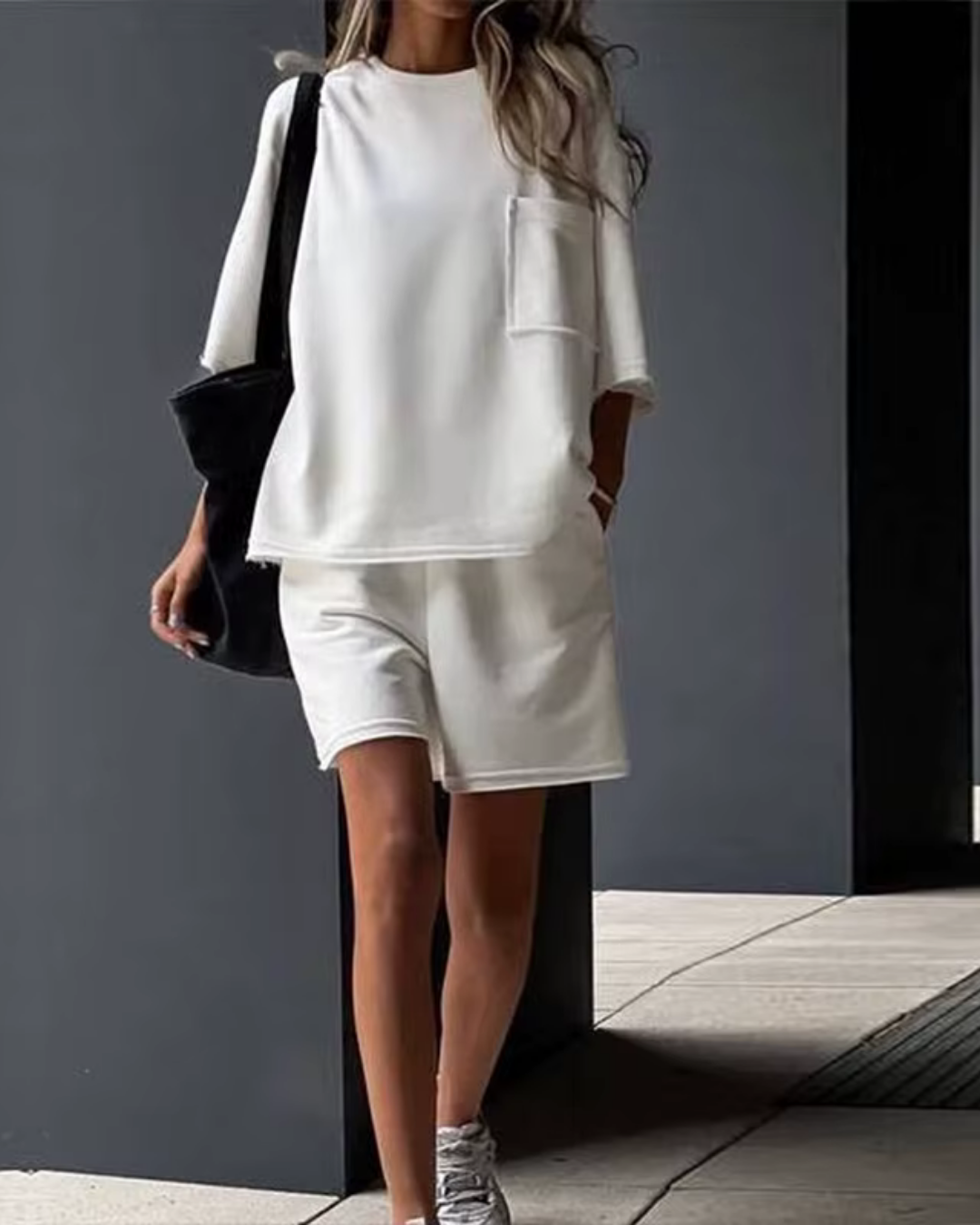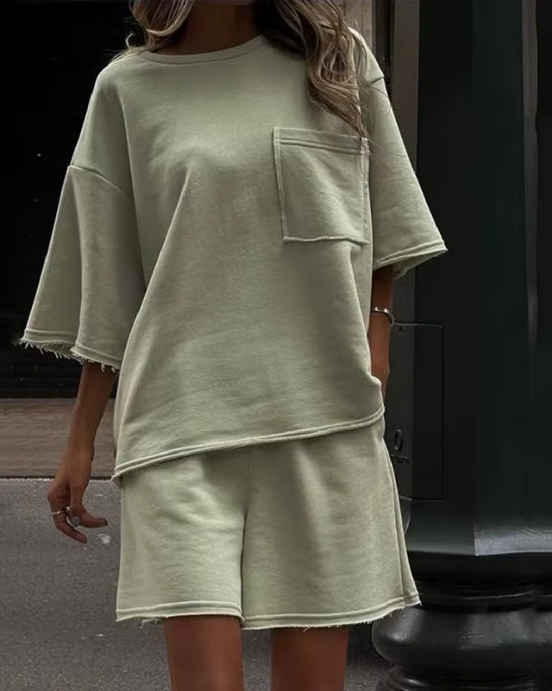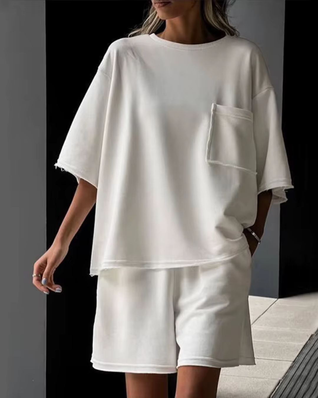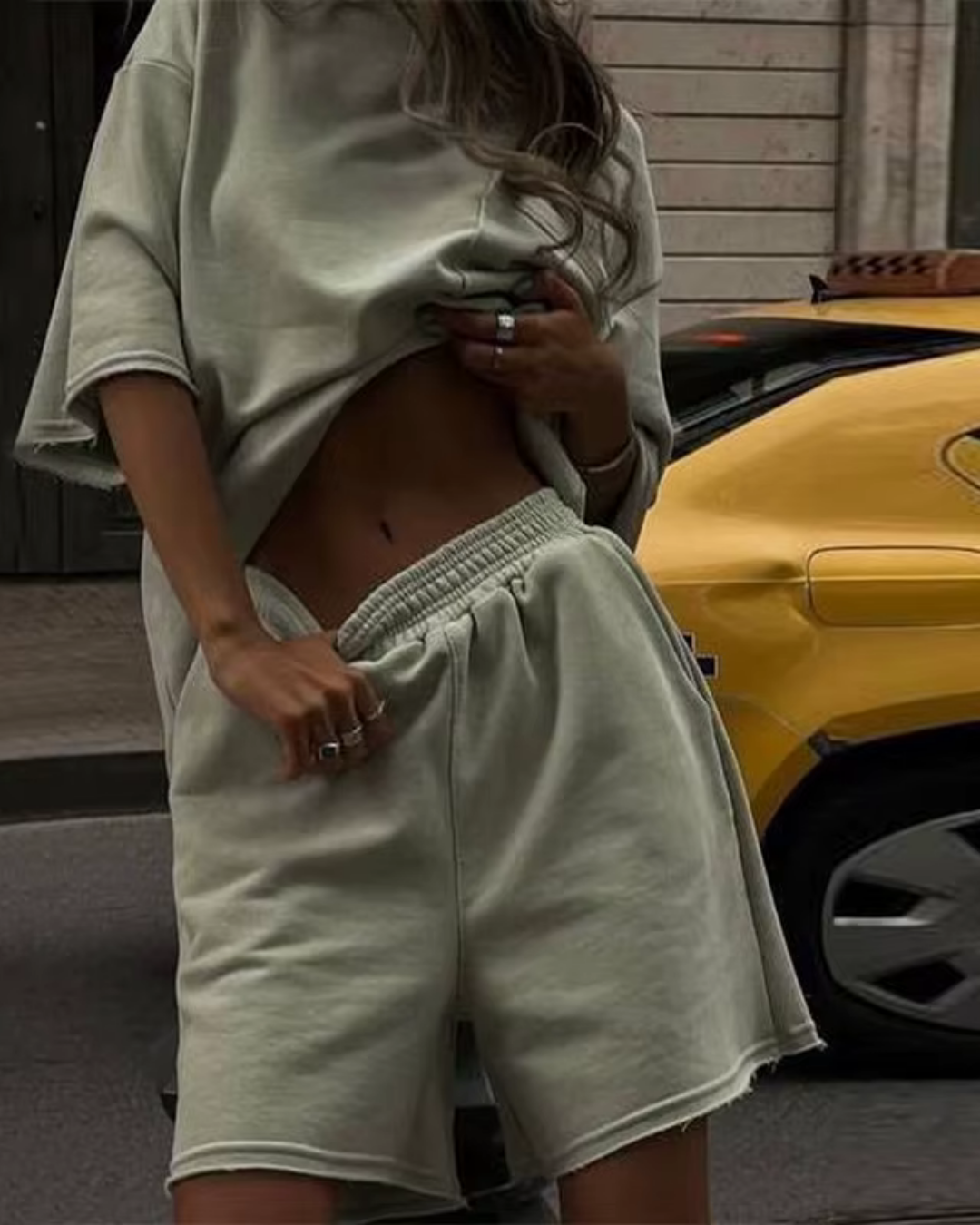 Dieses lässige Set ist perfekt für einen entspannten Tag. Mit seinem lockeren T-Shirt und den passenden Shorts vereint es Komfort mit modernem Stil und ist ideal für einen lässigen Look.