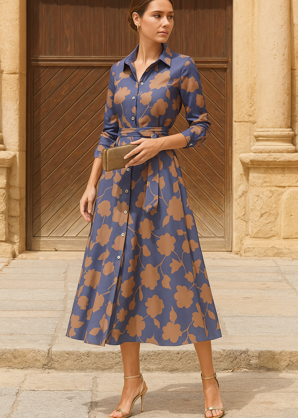Das Mia Kleid zeichnet sich durch eine fließende A-Linien-Silhouette, einen strukturierten Kragen und eine durchgehende Knopfleiste aus. Die langen Ärmel verleihen Eleganz, während der florale Druck eine sanfte, feminine Note bringt – perfekt für elegante Mittagessen, Outdoor-Veranstaltungen oder Spaziergänge durch die Stadt.