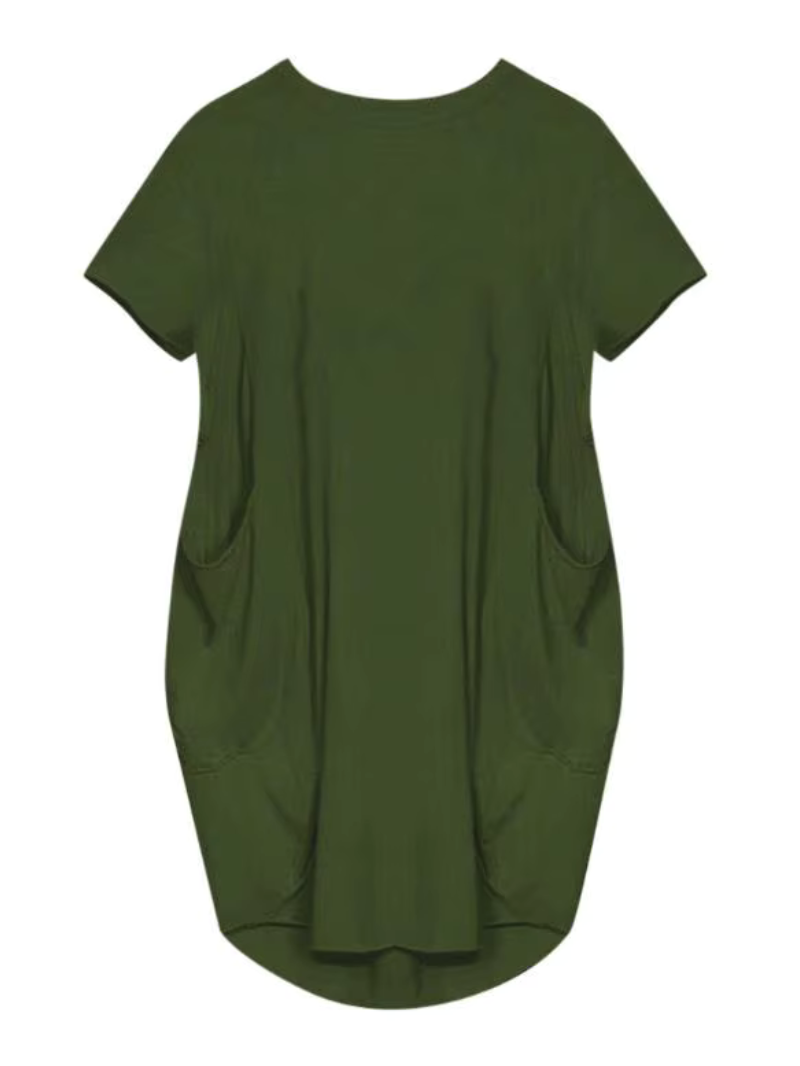 Mireya ist das perfekte Kleid für sonnige Tage: mit klassischem Rundhalsausschnitt, kurzen Ärmeln und einer weiten, fließenden Silhouette bietet es maximalen Komfort und lässt dabei jede Frau strahlen – unabhängig von der Konfektionsgröße.
