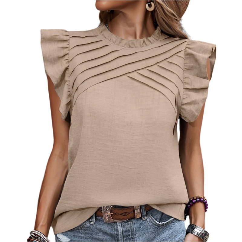 Stell dir ein Oberteil vor, das deinen Look sofort aufwertet — weich, feminin und leicht genug, um den ganzen Tag getragen zu werden. Sarah verbindet zarte Rüschen mit eleganten Falten und schafft so einen frischen, romantischen Stil, der genauso gut aussieht, wie er sich anfühlt.