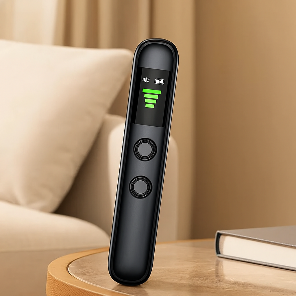Der SikkerScan Pro Detektor ist ein unverzichtbares persönliches Sicherheitstool zum Aufspüren versteckter Kameras, GPS-Tracker und drahtloser Abhörgeräte. Ob im Hotel, auf Reisen oder in sensiblen Umgebungen – dieser kompakte Scanner schützt Ihre Privatsphäre dank fortschrittlicher RF-Signalerkennung.