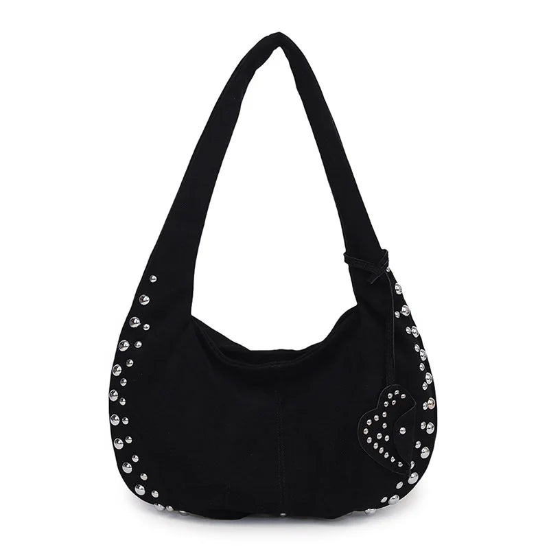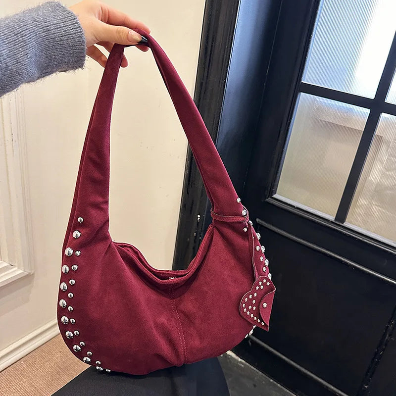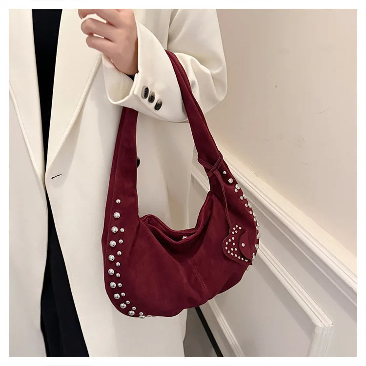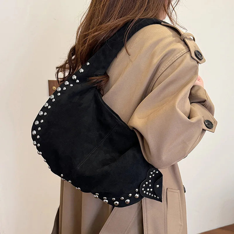 Für Nächte, die in den Morgen übergehen – eine Tasche, die Lässigkeit mit urbanem Glamour vereint. Die markanten Nieten setzen glänzende Akzente, während das weiche Material und die bequemen Griffe für höchsten Tragekomfort sorgen.