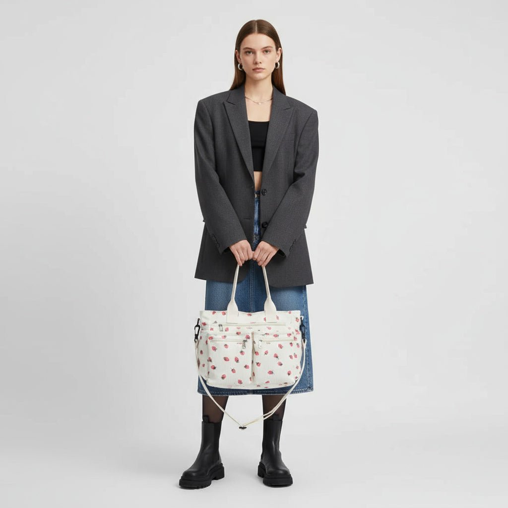 Die "Berry"-Tasche aus Cordstoff mit Erdbeermuster bietet eine weiche, leichte Textur und viel Stauraum. Das geräumige Innenfach ist mit weichem Polyester gefüttert und bietet Platz für all Ihre Essentials. Mit einem verstellbaren Schulterriemen, einem großen Hauptfach mit Reißverschluss und drei zusätzlichen Reißverschlusstaschen auf der Vorderseite ist diese Tasche sowohl stilvoll als auch praktisch.