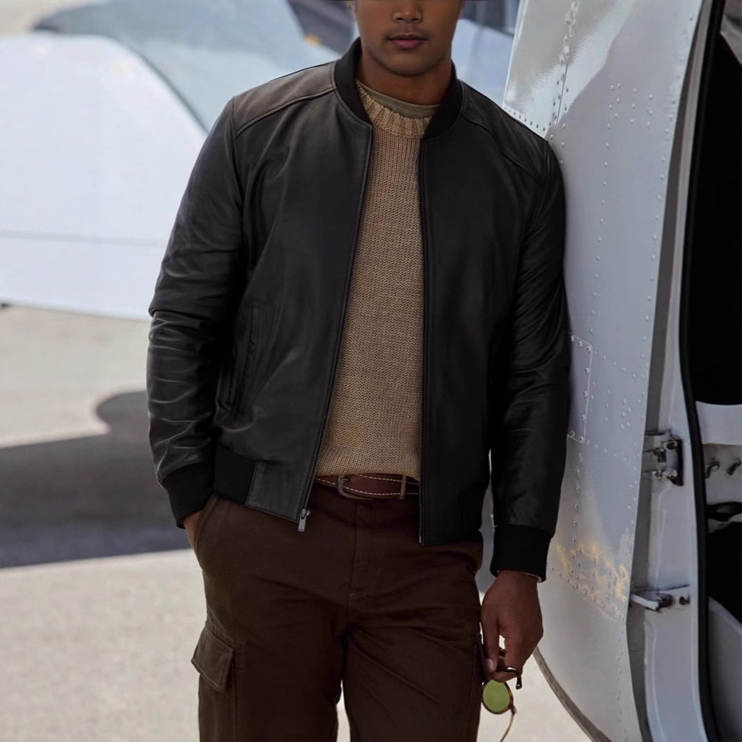 Herren elegante Lederjacke im Biker-Stil mit modischem Stehkragen Aliams