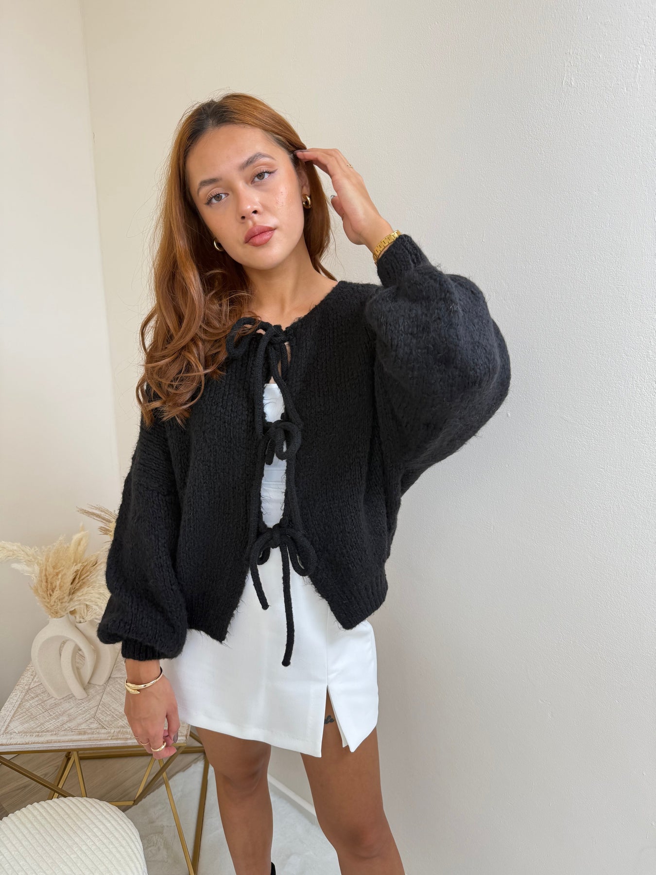 Trage den Schleifen-Cardigan zu einem figurbetonten Top oder als eigenständiges Statement-Piece, um deine feminine Ausstrahlung zu betonen. -