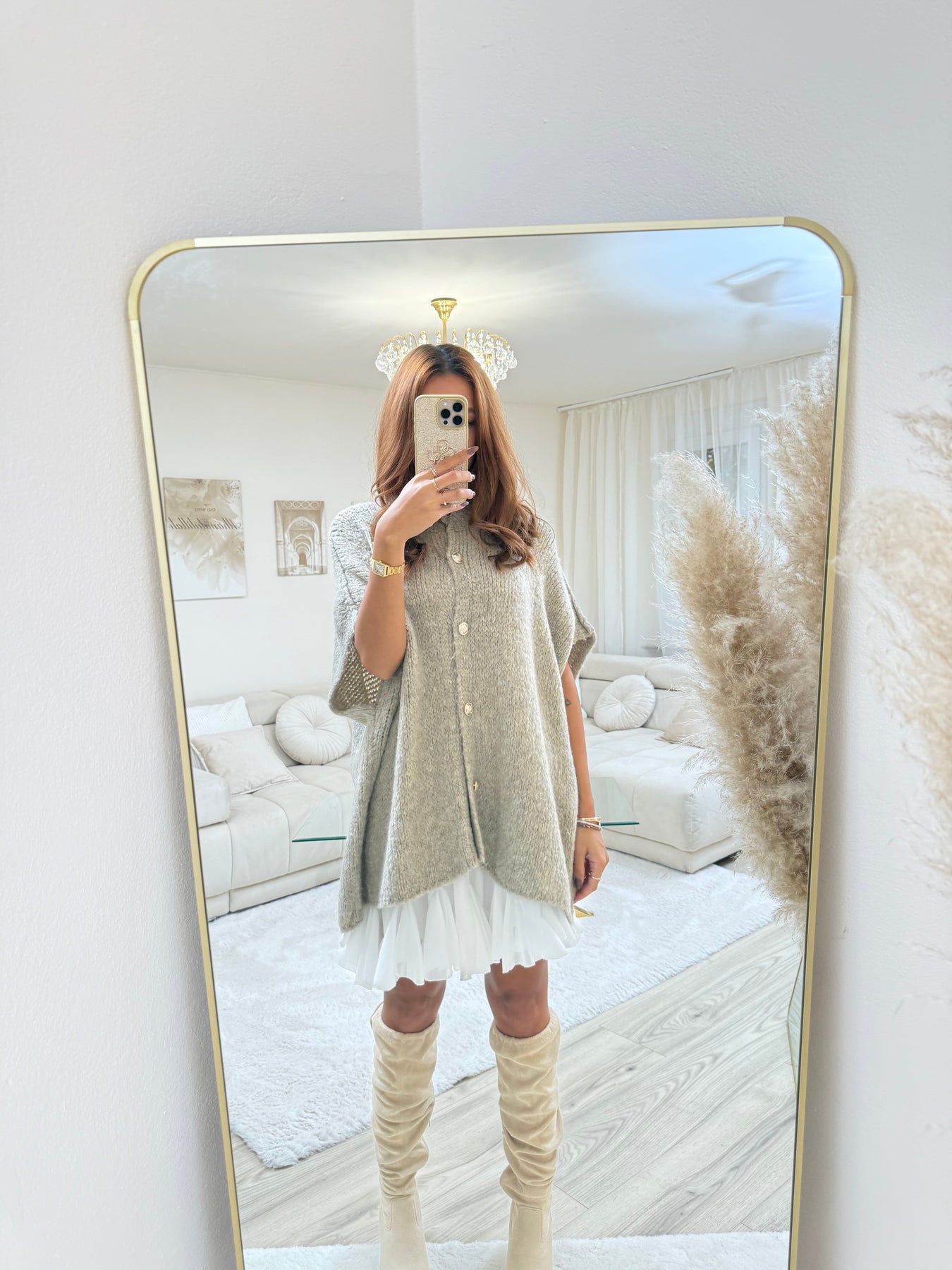 Stell dir vor, du kuschelst dich an einem kühlen Herbst- oder Wintertag in einen superweichen, oversized Strick-Pullunder, der nicht nur deinen Körper, sondern auch deinen Look perfekt umhüllt. Unser Strick-Pullunder ist das ultimative Wohlfühl-Piece für alle, die in der kalten Jahreszeit nicht auf Style, Komfort und ein modernes Oversized-Design verzichten möchten. Mit seinen kurzen Ärmeln, den trendigen, goldfarbenen Knöpfen und der lässigen Passform in Einheitsgröße bietet dieses Kleidungsstück einen unschlagbaren Mix aus Gemütlichkeit und Fashion-Statement. Es ist perfekt für entspannte Tage im Cosy-Look, egal ob im Home-Office, beim Stadtbummel oder bei einem besonderen Treffen mit Freunden.