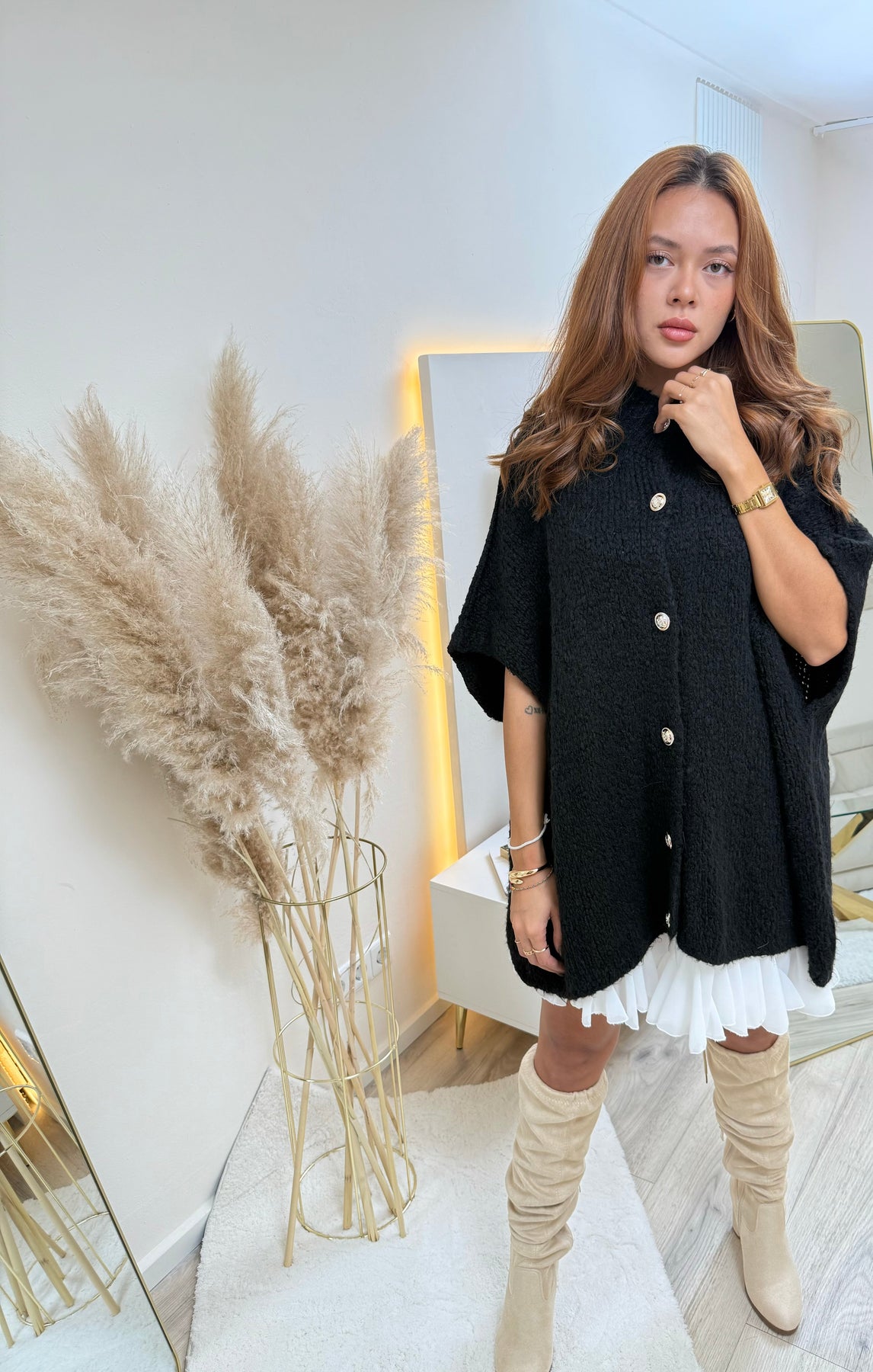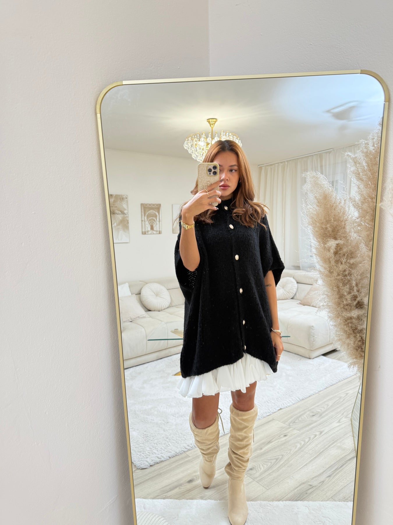• Modernes Oversize-Design: Der lässige, oversized Schnitt und die kurzen Ärmel in Kombination mit goldfarbenen Knöpfen verleihen dem Strick-Pullunder einen einzigartigen, trendigen Look, der immer im Trend liegt.