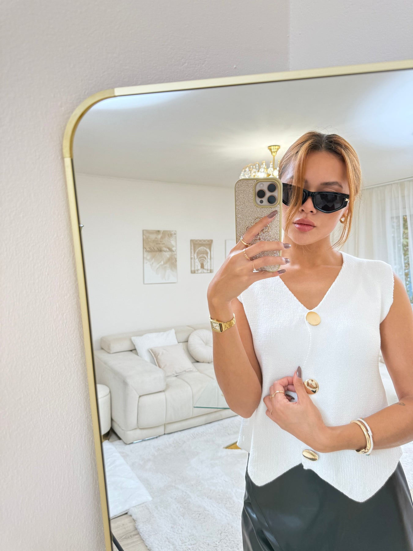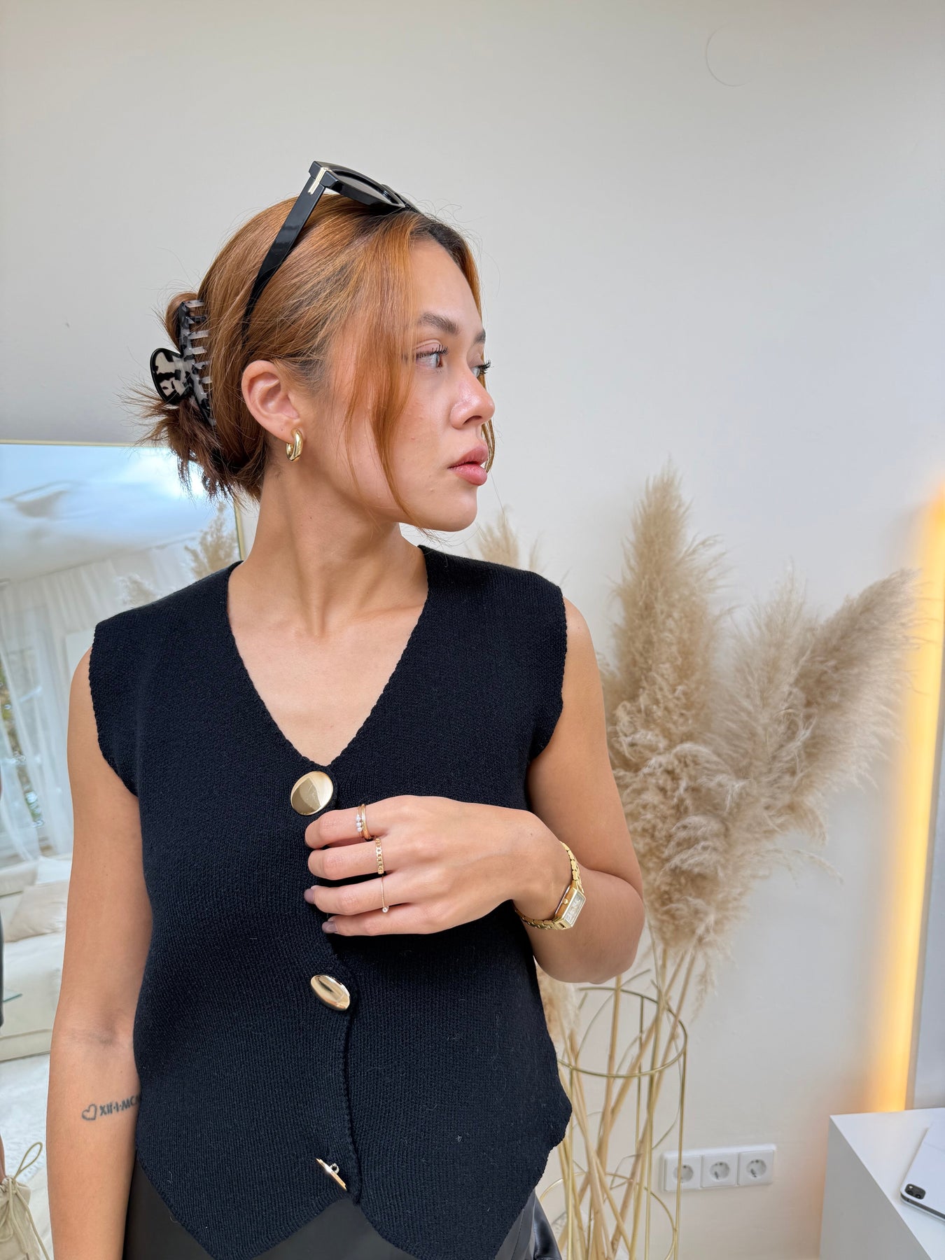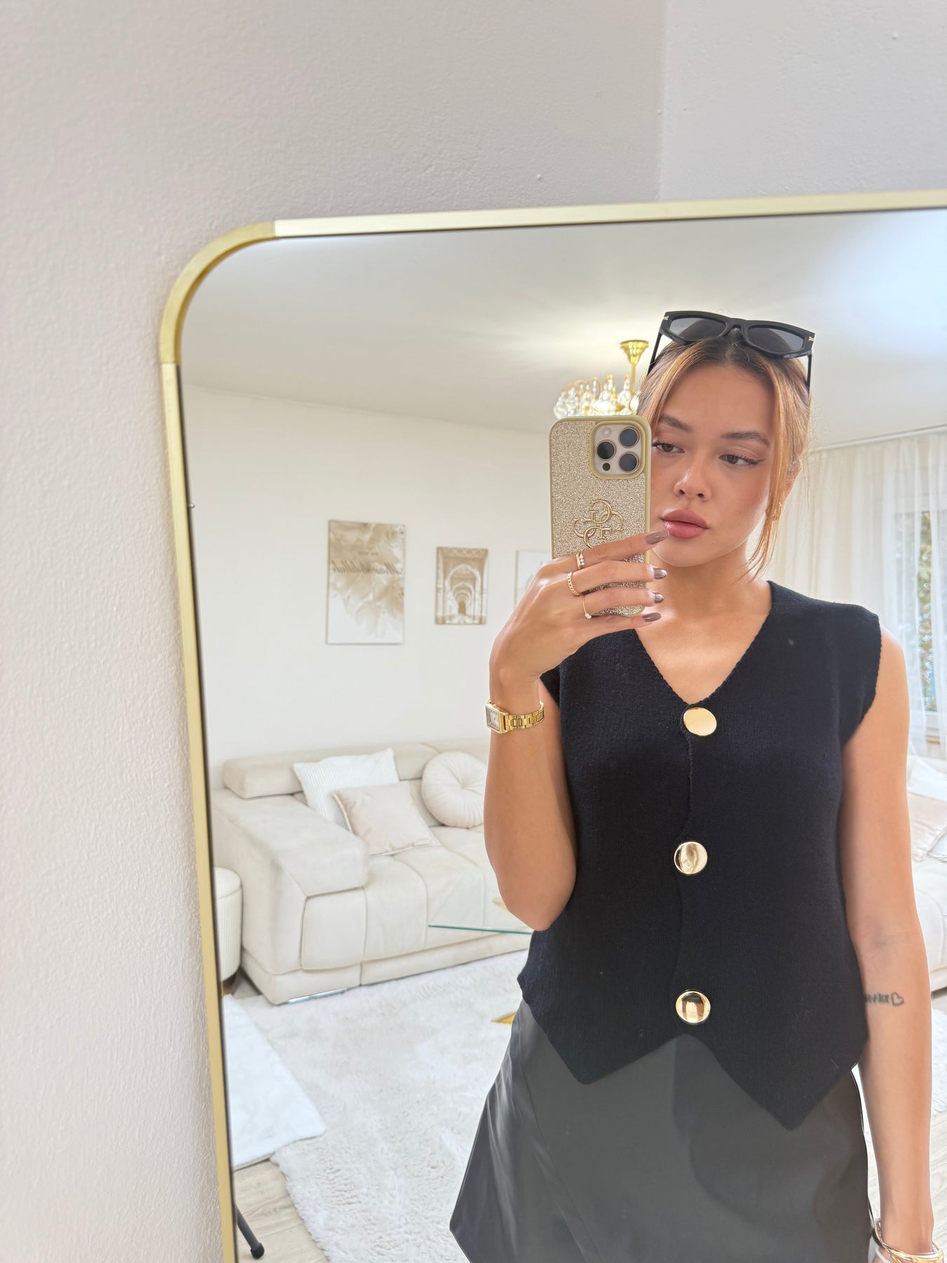 - Stilvolles Design: Die ärmellose Strickweste mit goldenen Knöpfen verleiht deinem Outfit sofort einen eleganten, modernen Touch.