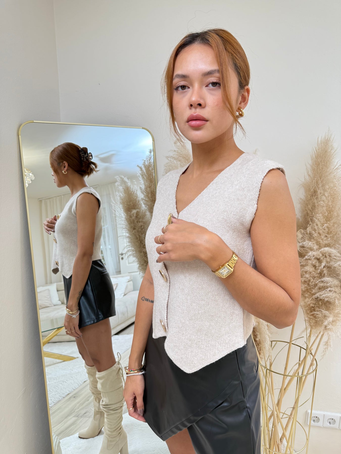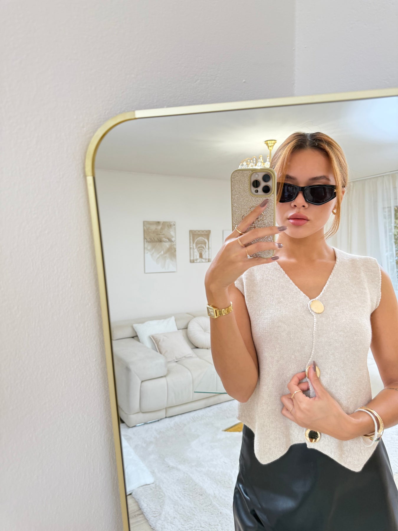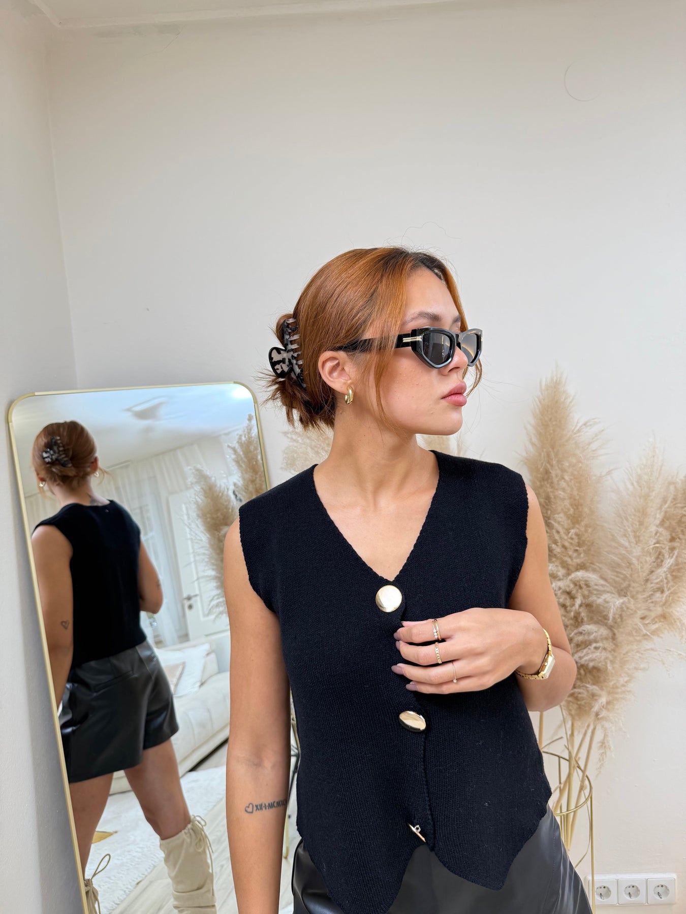 - Stilvolles Design: Die ärmellose Strickweste mit goldenen Knöpfen verleiht deinem Outfit sofort einen eleganten, modernen Touch.