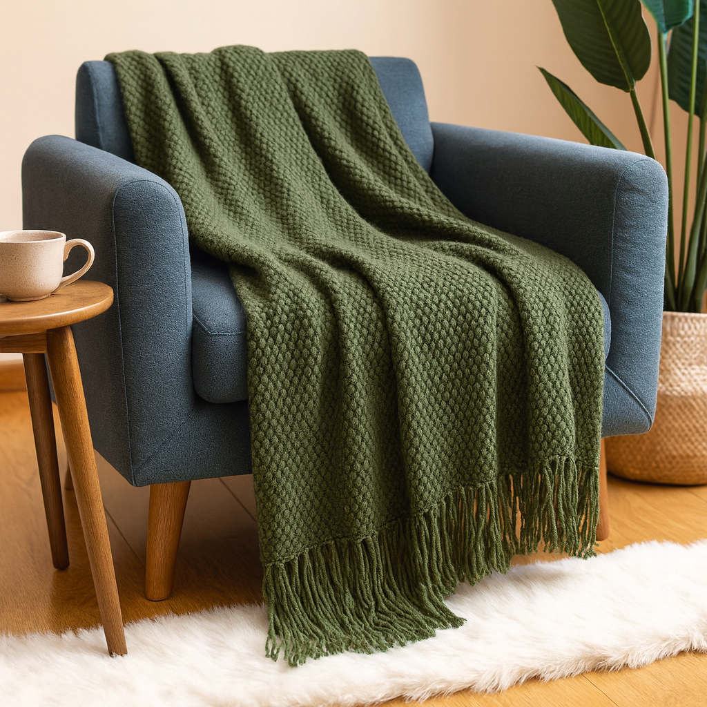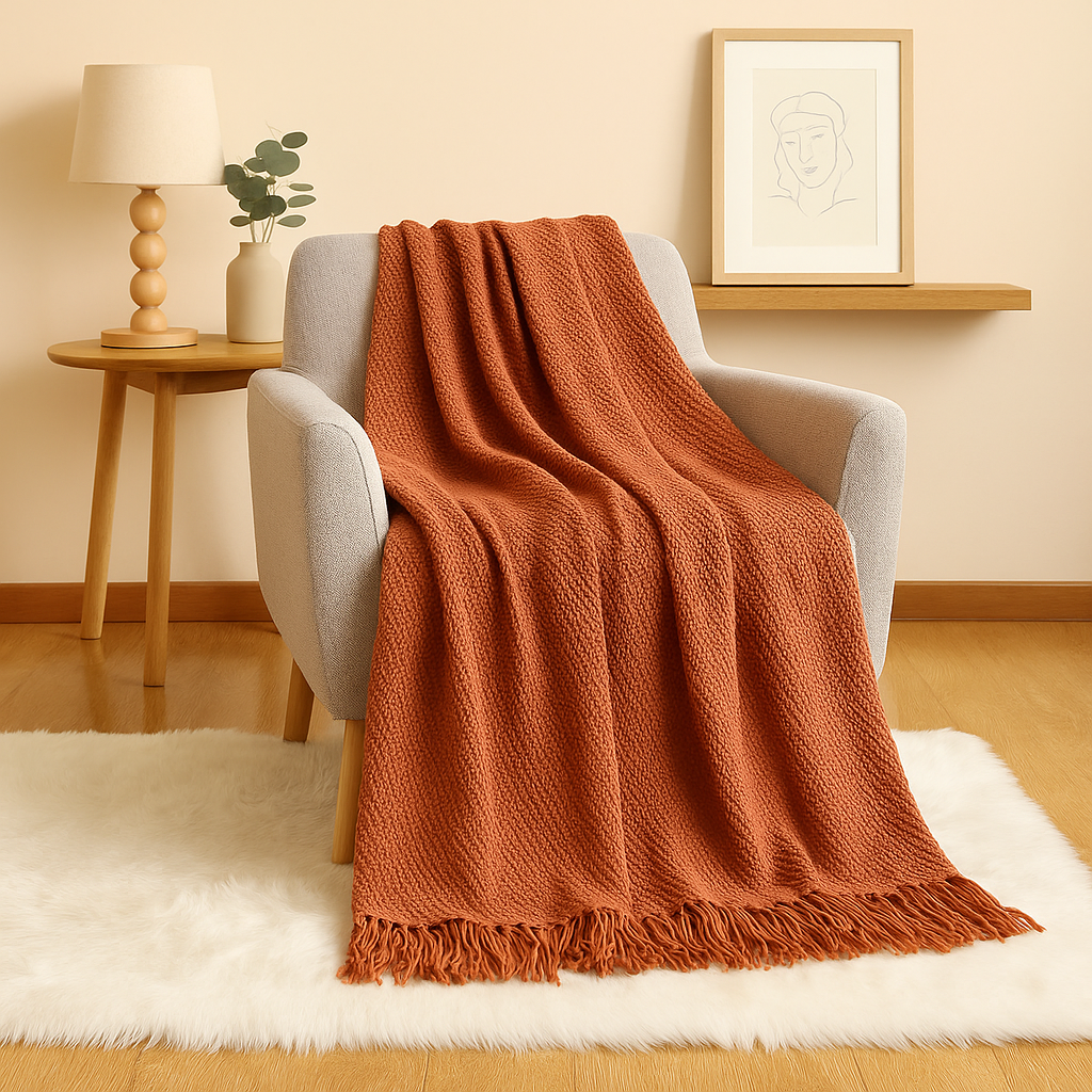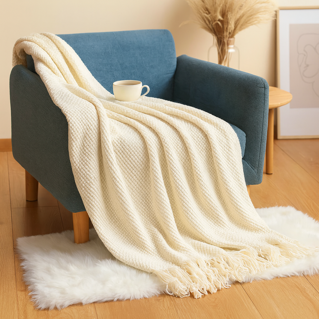 Entwickelt zum Drapieren über Sofas, Stühle oder Betten, verleiht diese Decke mühelose Eleganz. Ihre atmungsaktive Strickstruktur macht sie ganzjährig geeignet, verbindet ästhetische Details mit Vielseitigkeit und funktionalem Komfort.