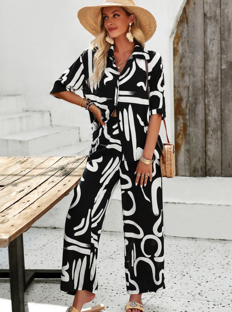 Entdecke unser Thora Bequemes zweiteiliges Set für Damen, bestehend aus einem schwarzen, bedruckten Button-up Hemd und passender Hose. Perfekt für legere Anlässe bietet dieses Set die ideale Balance zwischen Komfort, Stil und Praktikabilität. Ob beim Einkaufen, bei einem entspannten Ausflug oder beim Relaxen zu Hause – dieses Set sorgt dafür, dass du immer mühelos schick aussiehst und dich gleichzeitig wohlfühlst.