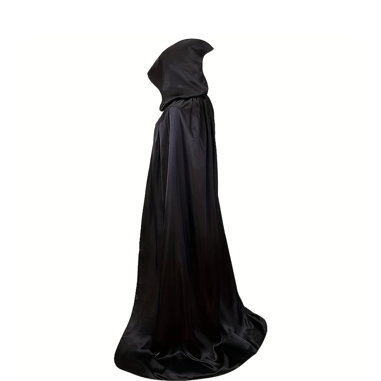 Dieser lange Halloween-Umhang besitzt eine lockere Passform mit großer Kapuze und vorderem Bindeband. Er ist für Erwachsene und Jugendliche geeignet und kann mit unterschiedlichen Kostümen kombiniert oder als zusätzliche Lage getragen werden.