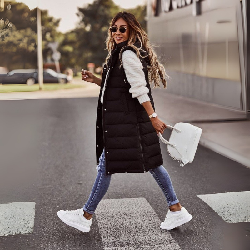 Diese knielange Steppweste für Damen bietet funktionale Wärme und eignet sich zum Tragen über Pullover oder Langarmshirts. Sie ist für kühle Tage in Herbst und Winter konzipiert und ergänzt Alltagsbekleidung um eine zusätzliche Lage.