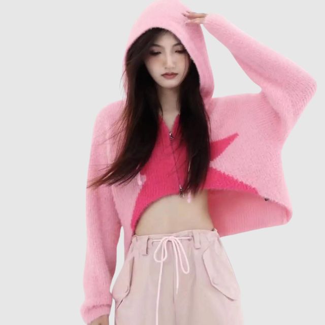 Zenaida® | Kurzes Strick-Sweatshirt mit Kapuze und Sternen-Print